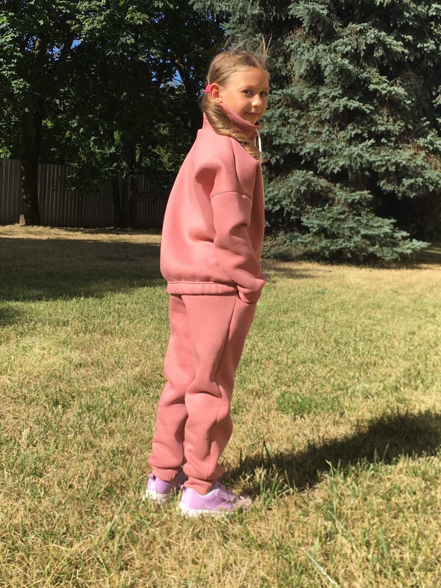 Костюм выполнен из футера 3-хнитки с начёсом. Состоит из свитшота и брюк. Брюки сверху на широкой резинке и со шнурком, снизу на манжете с отворотом. Свитшот с воротником-стойкой, украшен шнурком, снизу вставлена резинка, рукава на манжетах с отворотом.